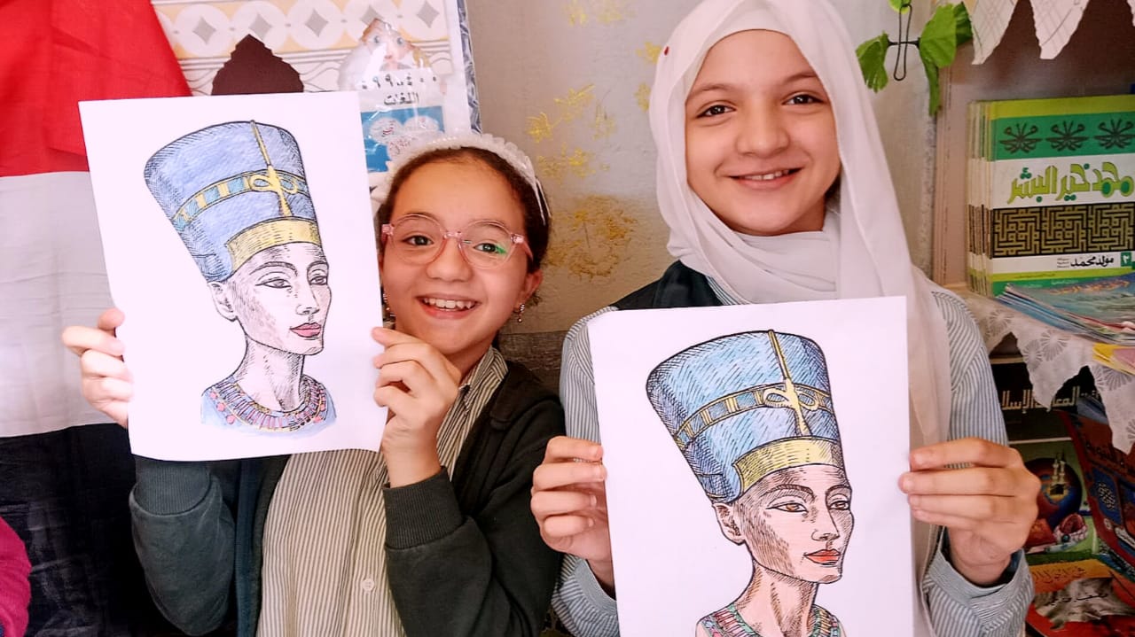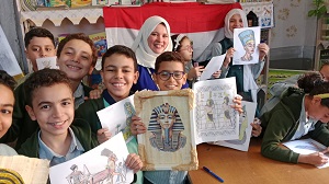أعقب ذلك ورشة فنية دربت خلالها الفنانة شيماء إسماعيل الطلاب على تصميم لوحات على شكل بردية لكل من الملك توت عنخ آمون، الملكة نفرتيتي والملكة كليوباترا.