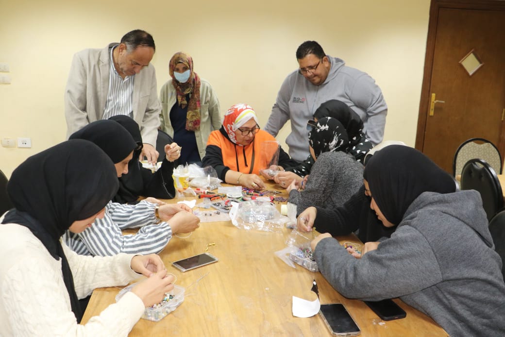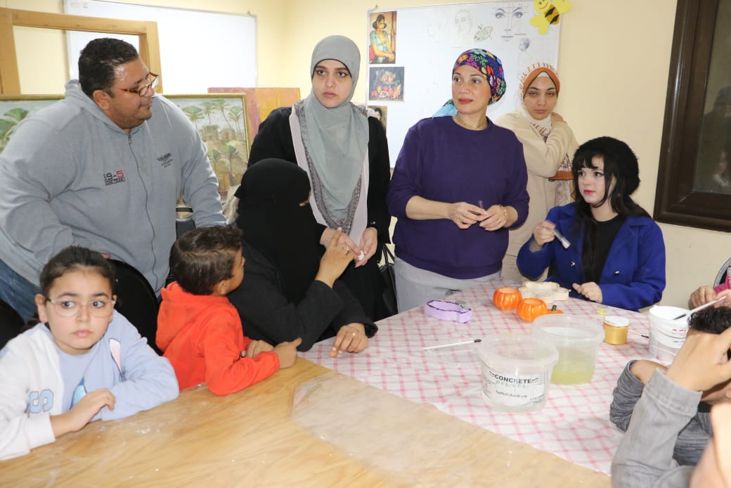 أما في ورشة الكونكريت واصلت المدربة سهام إسماعيل تدريب الشباب على تشكيل وصقل القطع الجبسية، مع إضافة لمسات التلوين والطلاء، لإنتاج وحدات ديكورية مبتكرة يسهل تسويقها.