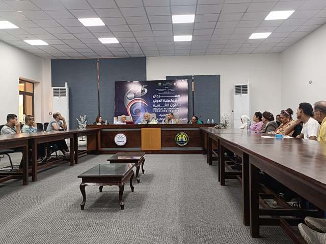 نفذت الندوة بقاعة المؤتمرات بالقرية الأولمبية، وأدارها الشاعر د. مسعود شومان رئيس الإدارة المركزية للشئون الثقافية، وشارك فيها د. خالد أبو الليل القائم بأعمال رئيس الهيئة العامة للكتاب، د. مدحت فهمي، المايسترو أشرف عوض الله والباحث بأطلس المأثورات الشعبية، والفنانة إيناس عبد العزيز عبد الظاهر، مديرة فرقة رضا للفنون الشعبية، بحضور د. شعيب خلف مدير عام إقليم القناة وسيناء الثقافي، والفنان ماهر كمال مدير المهرجان.