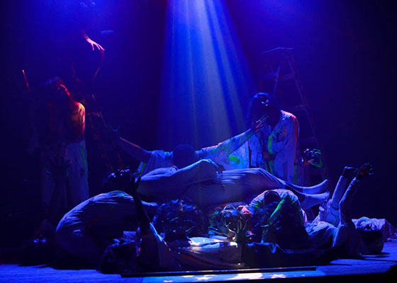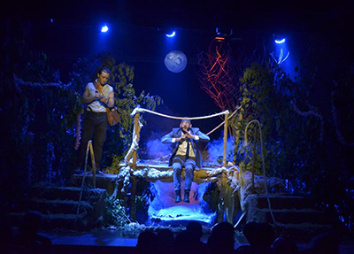 من خلال منظر مسرحى قاسٍ؛ غابة كثيفة بالأشجار وجسر خشبى وإضاءة زرقاء ممزوجة بصورة القمر والليل القاتم. استهل المخرج حالة العرض بوحشية المكان الذى يعكس صفاته على الشخصيات، لنجد السارق بمظهره القوى وملامحه الحادة والسكين التى لا تفارقه..