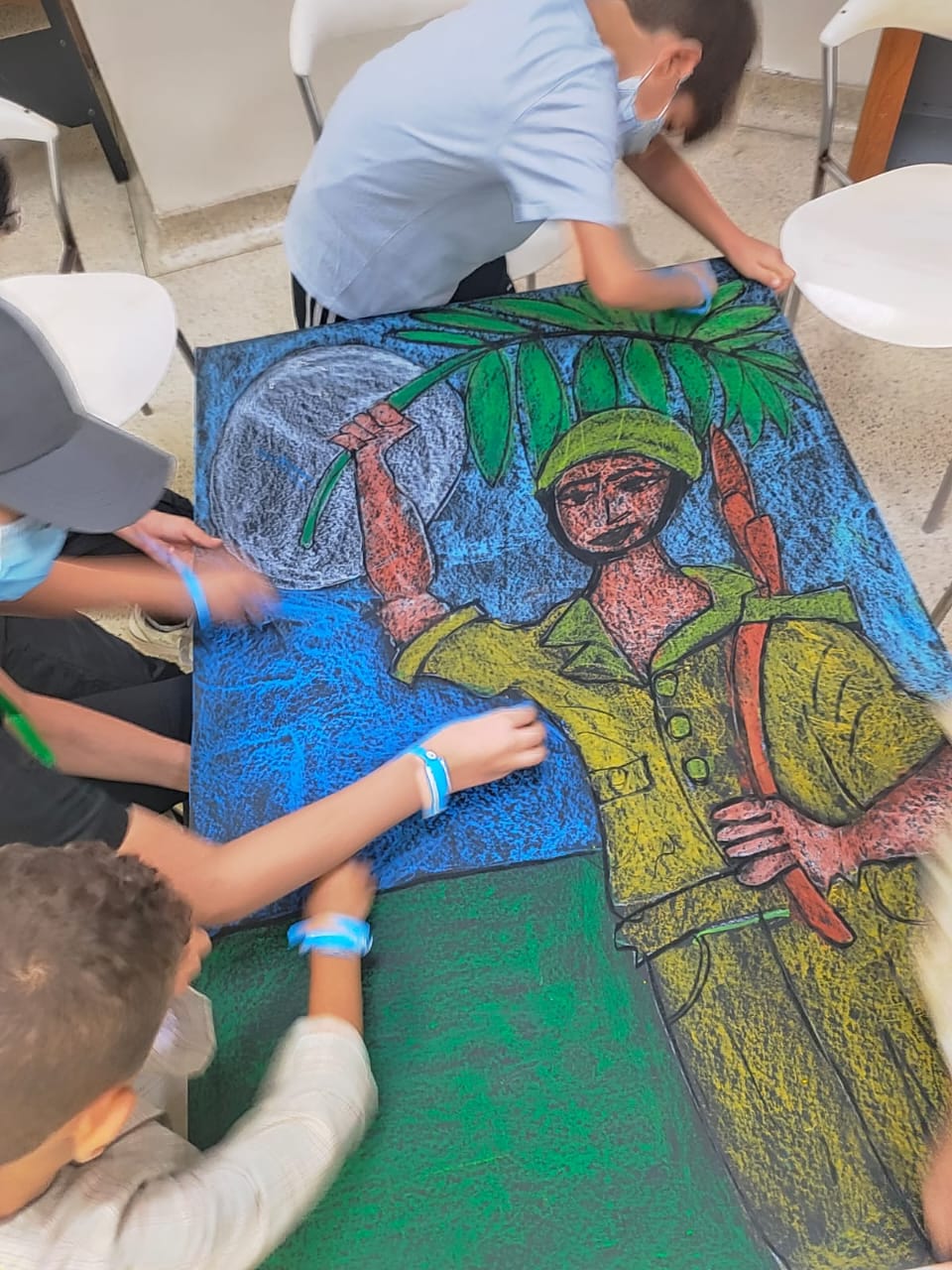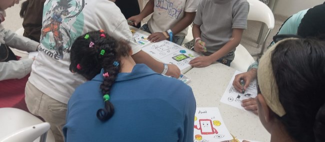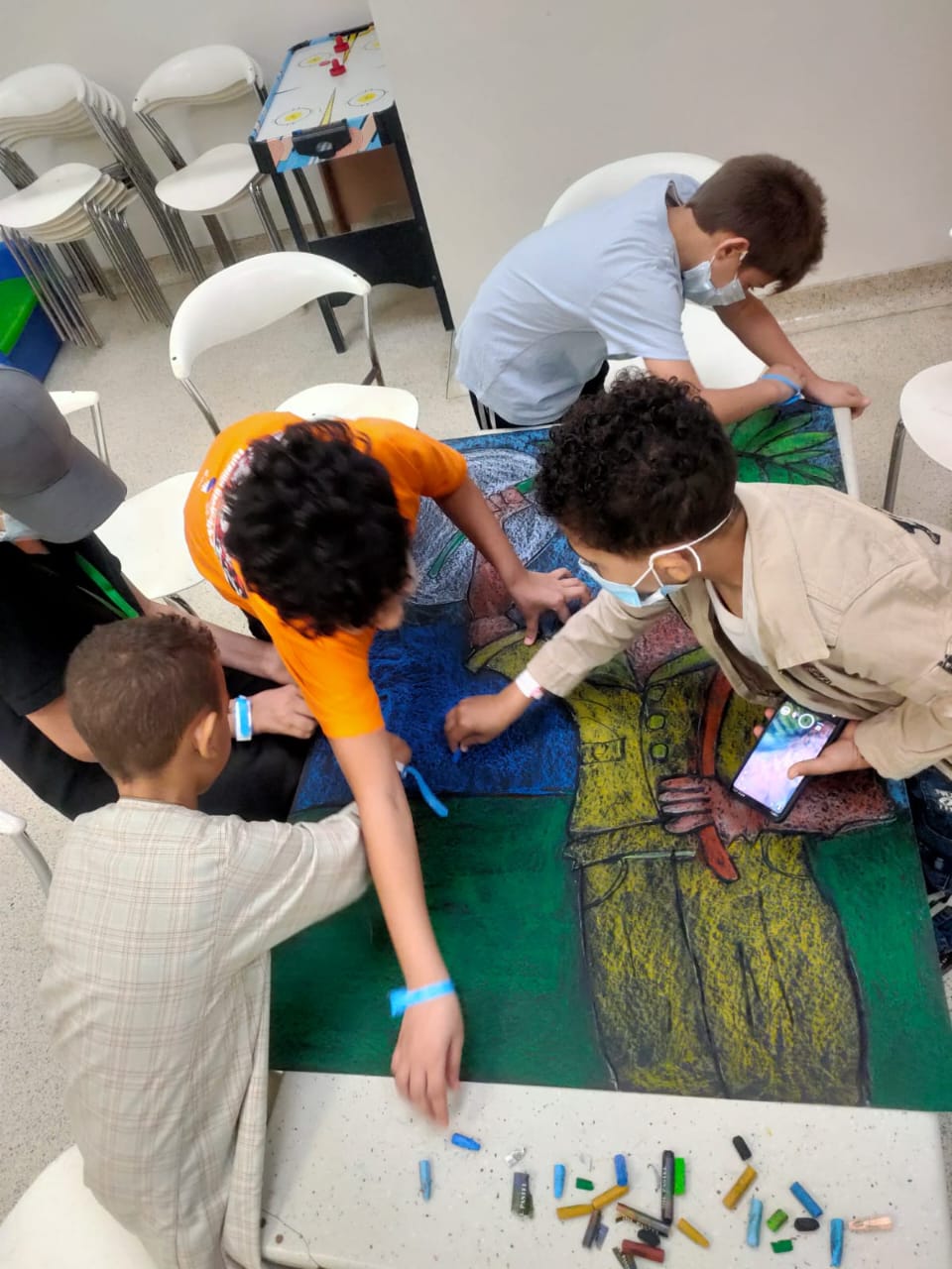أعقب ذلك ورشة تصميم لوحة جماعية للتعبير عن الصمود والإصرار في استعادة الأرض، بما يرسخ في وجدان الأطفال قيم حب الوطن والانتماء.