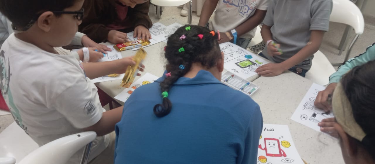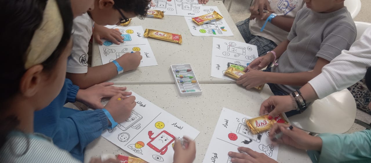 كما نفذت ورشة تفاعلية للأطفال بعنوان "الكروت الملونة"، يقوم خلالها كل طفل بقراءة العبارة المكتوبة على الكارت والمتعلقة باستخدام الهاتف المحمول، ثم يحدد مدى إيجابيتها أو سلبيتها ويشارك في مناقشتها.