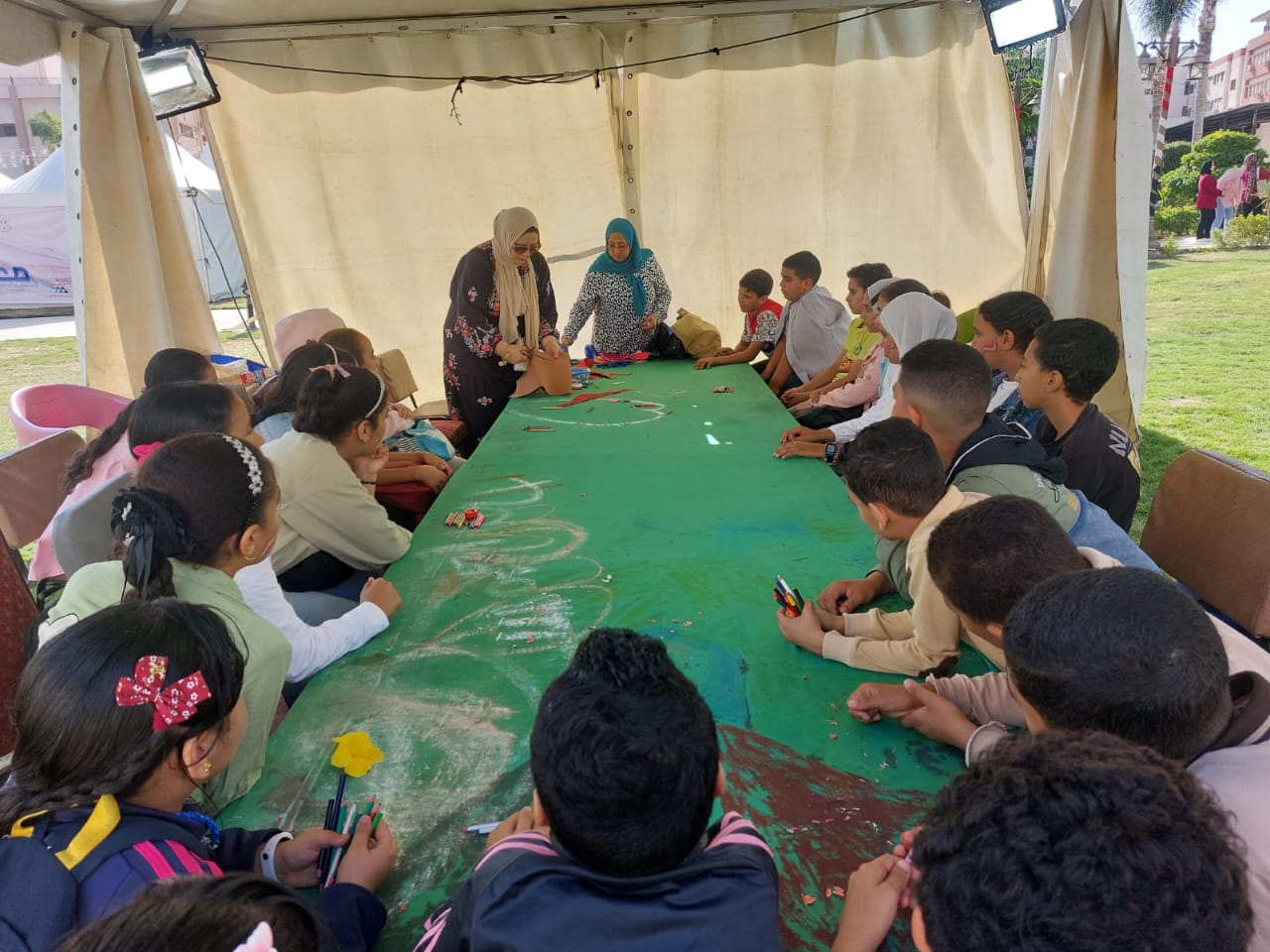 وشهد مخيم الطفل استمرار الورش الفنية المتنوعة وتضمنت ورشة تصميمات بالجوخ بالفوم، ورشة رسم وتلوين، ورشة تصميمات بالخرز، رسم على الوجه، وورشة إعادة تدوير خامات، وغيرها.