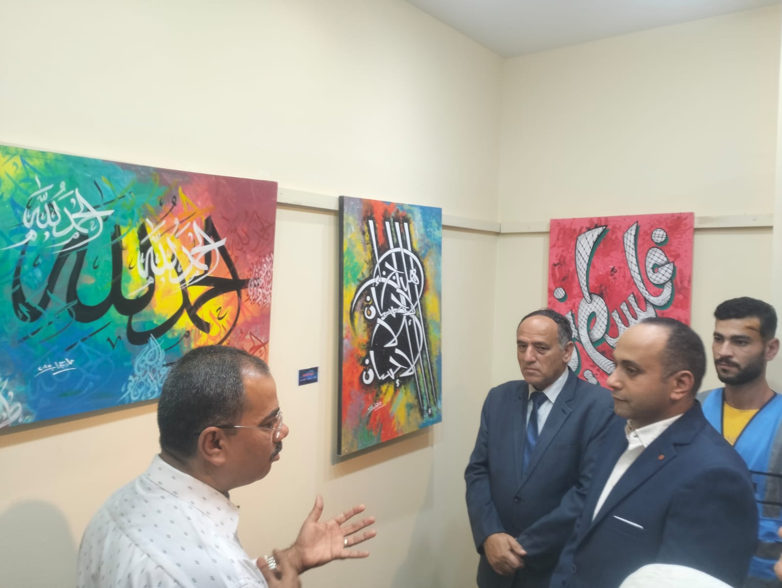فيما شارك الفنان والخطاط عماد حجاب، بخمس لوحات فنية، اللوحة الأولى بعنوان "فلسطين.. جرح السنين"، موضحا أنها تجسد القضية الفلسطينية وتعكس مأساة ومعاناة الشعب الفلسطيني على مدار العقود، أما الثانية بعنوان "هل جزاء الإحسان إلا الإحسان"، منفذ بأسلوب الخط الحر، حيث استخدم تكوين متداخل من الحروف العربية، يرمز إلى الاحتواء والوحدة، مع توظيف اللون الأسود لمنح العمل عمق بصري وروحانية فنية.