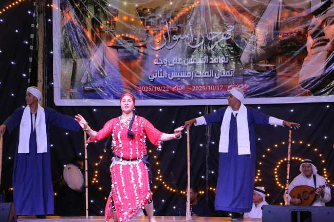أضاءت العروض الفلكلورية لفرق الفنون الشعبية، فعاليات الحفل الفني الثاني الذي شهده مسرح السوق السياحي بمدينة أبو سمبل، في ليلة تعامد الشمس، ضمن مهرجان أسوان الذي يقام تحت رعاية الدكتور أحمد فؤاد هنو وزير الثقافة، واللواء دكتور إسماعيل كمال محافظ أسوان، وتنظمه الهيئة العامة لقصور الثقافة برئاسة اللواء خالد اللبان، احتفالا بظاهرة تعامد الشمس على وجه الملك رمسيس الثاني.