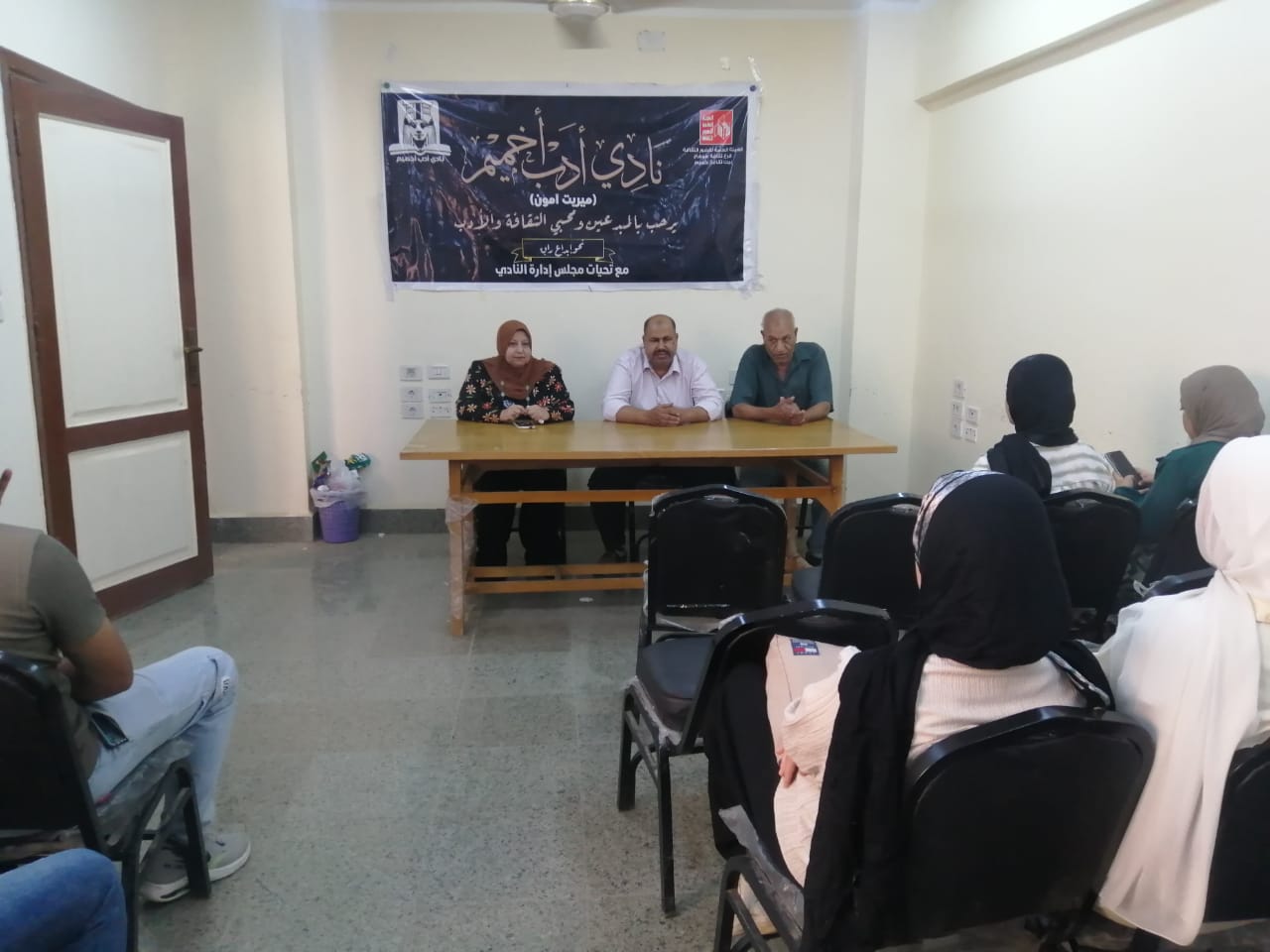 وشهد بيت ثقافة أخميم لقاء بعنوان "الشباب وتعزيز الهوية المصرية" استهله الأديب أحمد علي خضري بحديث عن الهوية المصرية موضحا أنها تمثل الروح العريقة التي تسكن في وجدان كل مصري وتشهد على حضارة عمرها آلاف السنين، وتجمع