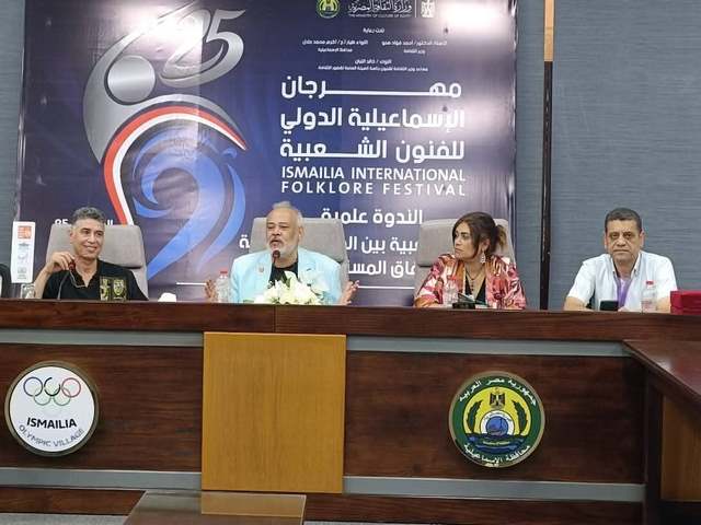 شهدت قاعة المؤتمرات بالقرية الأولمبية بمحافظة الإسماعيلية، اليوم الأحد، أولى الندوات العلمية المتخصصة ضمن فعاليات الدورة الخامسة والعشرين من مهرجان الإسماعيلية الدولي للفنون الشعبية، المنعقد تحت رعاية الدكتور أحمد فؤاد هنو وزير الثقافة، واللواء أكرم جلال محافظ الإسماعيلية، وتنظمه وزارة الثقافة ممثلة في الهيئة العامة لقصور الثقافة والإدارة المركزية للعلاقات الثقافية الدولية، بالتعاون مع محافظة الإسماعيلية، وبالتنسيق مع وزارة الشباب والرياضة، وهيئة قناة السويس، وهيئة تنشيط السياحة.