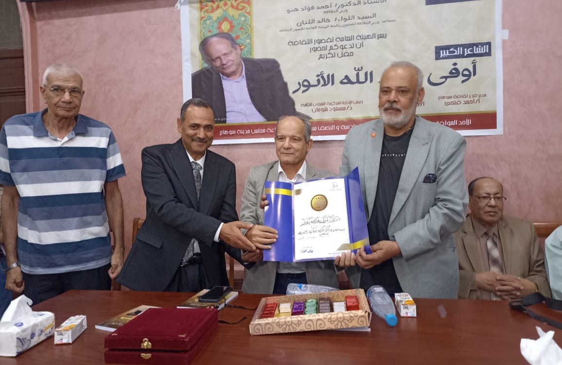 كرمت الهيئة العامة لقصور الثقافة برئاسة اللواء خالد اللبان، الشاعر الكبير أوفى عبد الله الأنور، ضمن برنامج "العودة إلى الجذور"، الذي أقيم بقاعة المؤتمرات والندوات بمجلس مدينة سوهاج، وذلك في إطار برنامج وزارة الثقافة للاحتفاء برموز الإبداع الأدبي والفكري في مختلف المحافظات.