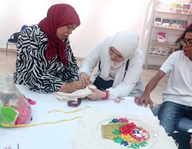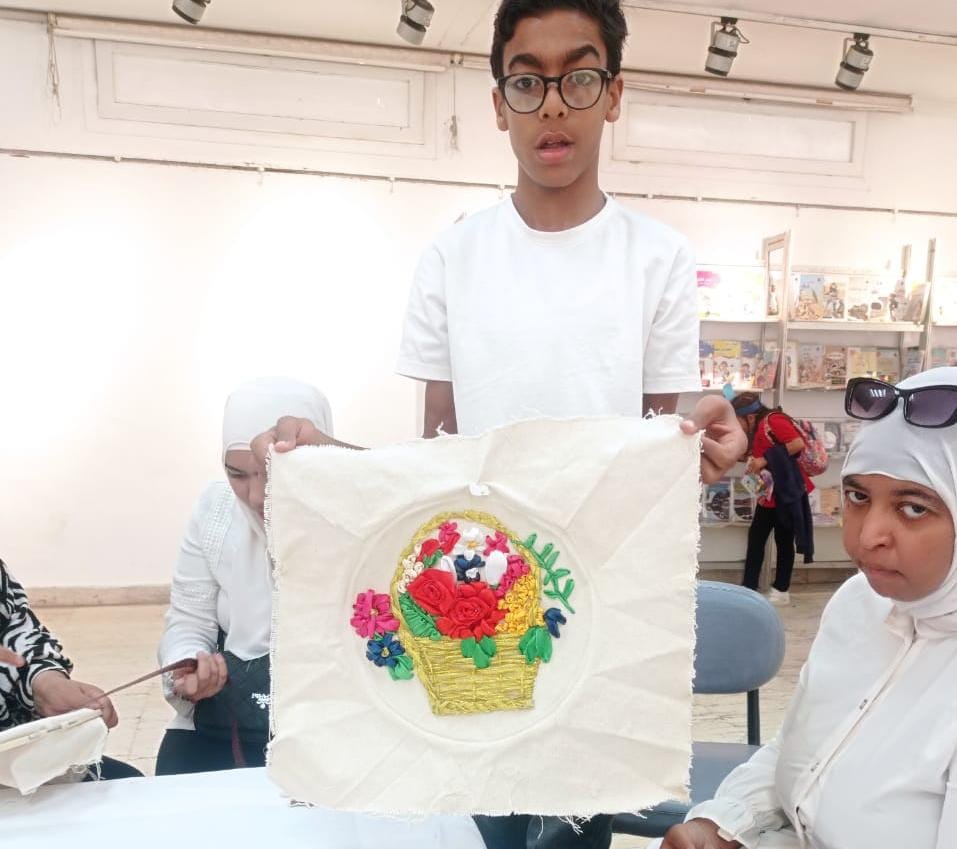 قدمت الورش المدربة نجلاء شحاتة، وشملت ورشة لتعليم التطريز على القماش، لعدد من أطفال جمعية صناع الغد لذوي الإعاقة الذهنية، عرفتهم خلالها على استخدام الطارة وخيوط الساتان لإنتاج قطع فنية مميزة بطريقة مبسطة.