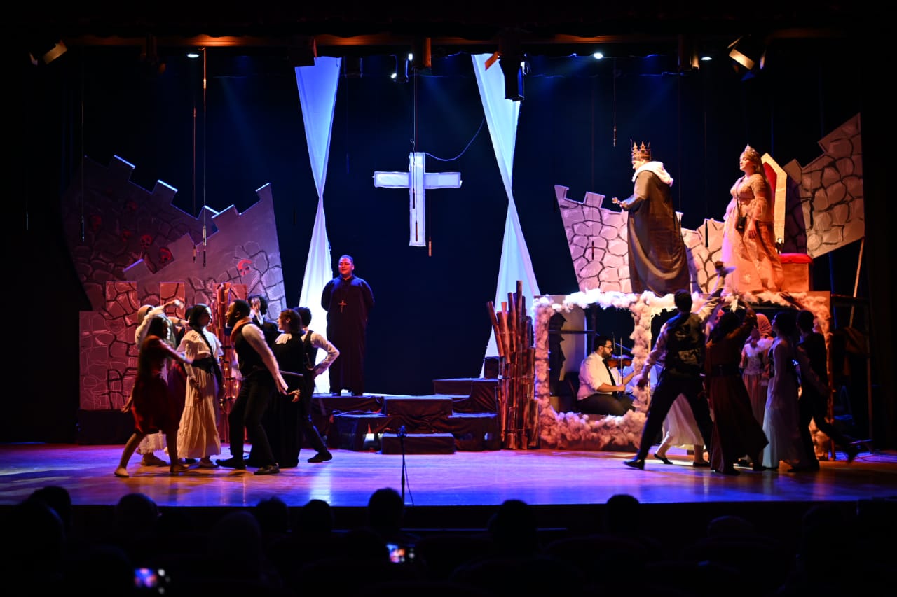 وأشار الملحن عاصم علاء، إلى أن العرض جاء في قالب غنائي متكامل، حيث تم توظيف الجمل الحوارية مع الألحان بما يتناسب مع كل مشهد، موضحا أن الموسيقى تنوعت لتعكس الحالات الدرامية المختلفة، كما جاء في مشاهد الزواج والاحتفال، والأخرى الخاصة بالغموض والرعب عند ظهور الشبح، وصولا إلى اللحظات التي تتجلى فيها العواطف الإنسانية بين الأم وهاملت.