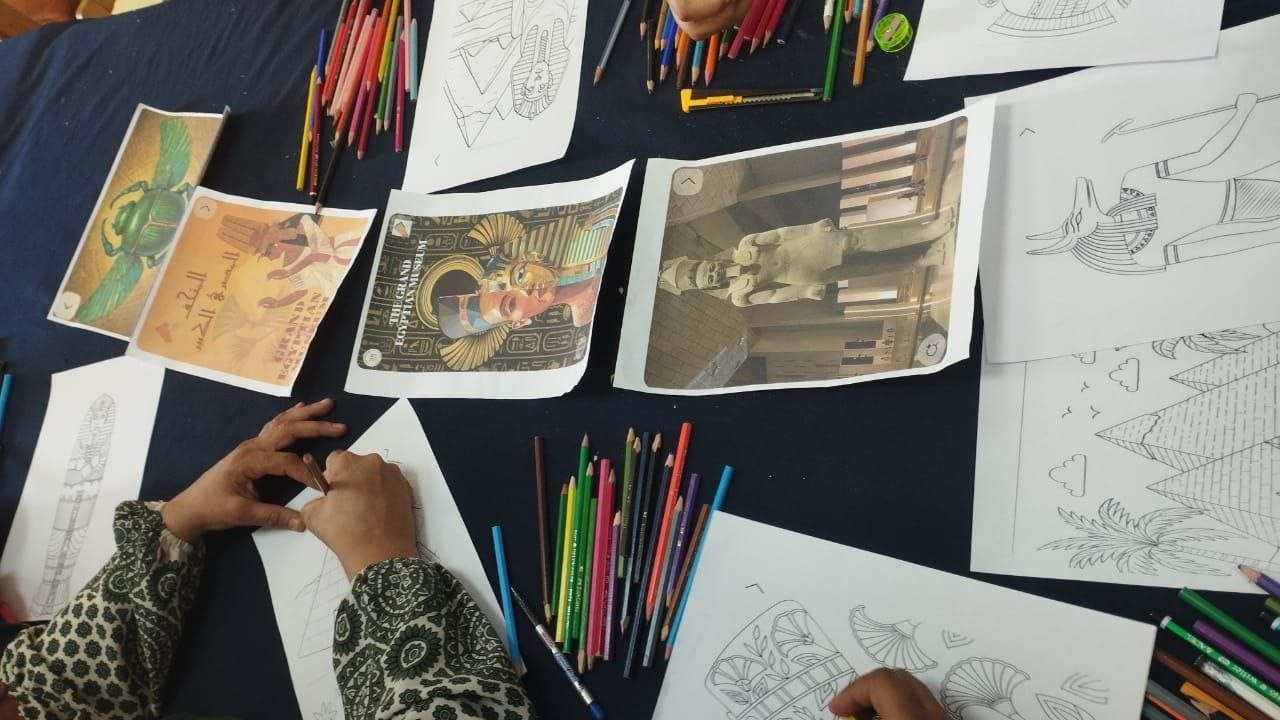 كما نفذ القصر ورشة تصميم لوحات عن الرموز المصرية القديمة، بجانب ورشة أشغال يدوية شملت تصميم علم مصر وإكسسوارات تدريب مشيرة محمد، وسط تفاعل كبير من المشاركين.