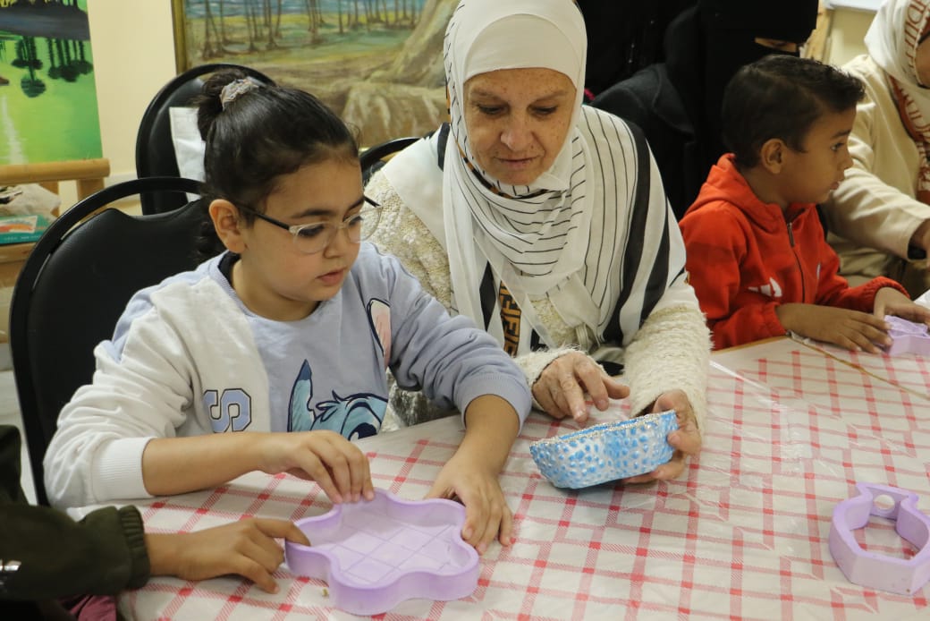 أما في ورشة الكونكريت واصلت المدربة سهام إسماعيل تدريب الشباب على تشكيل وصقل القطع الجبسية، مع إضافة لمسات التلوين والطلاء، لإنتاج وحدات ديكورية مبتكرة يسهل تسويقها.