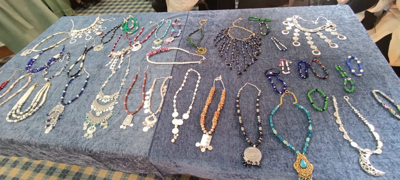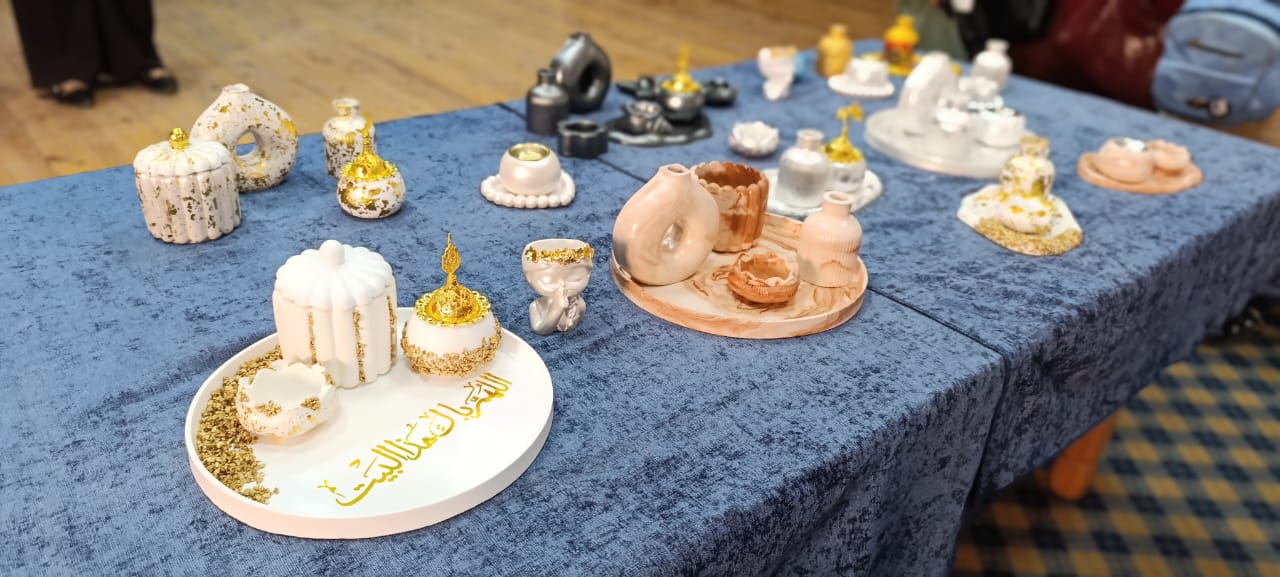 وضم المعرض 98 قطعة فنية، وتنوعت المعروضات بين منتجات ورشة "الخيامية" للمدربة هبه فتوح، والتي تميزت بأشكال تراثية مستوحاة من الهوية المصرية، من بينها راقص التنورة، وزهرة اللوتس، إلى جانب تصميمات ذات طابع رمضاني، ونماذج من أعمال ورشة "الإكسسوارات"، التي تنوعت بين العقود والمشغولات اليدوية المصنوعة من الأحجار الكريمة والخرز الملون بألوانها المبهجة، للمدربة سماح فاروق، إلى جانب الأعمال الفنية الناتجة عن ورشة "الكونكريت"، والتي تضمنت أشكالا ديكورية متنوعة إلى جانب الصواني والمباخر، للمدربة شيرين عفيفي.