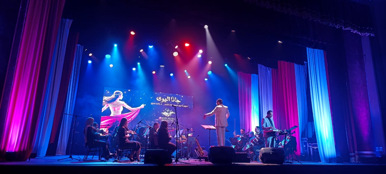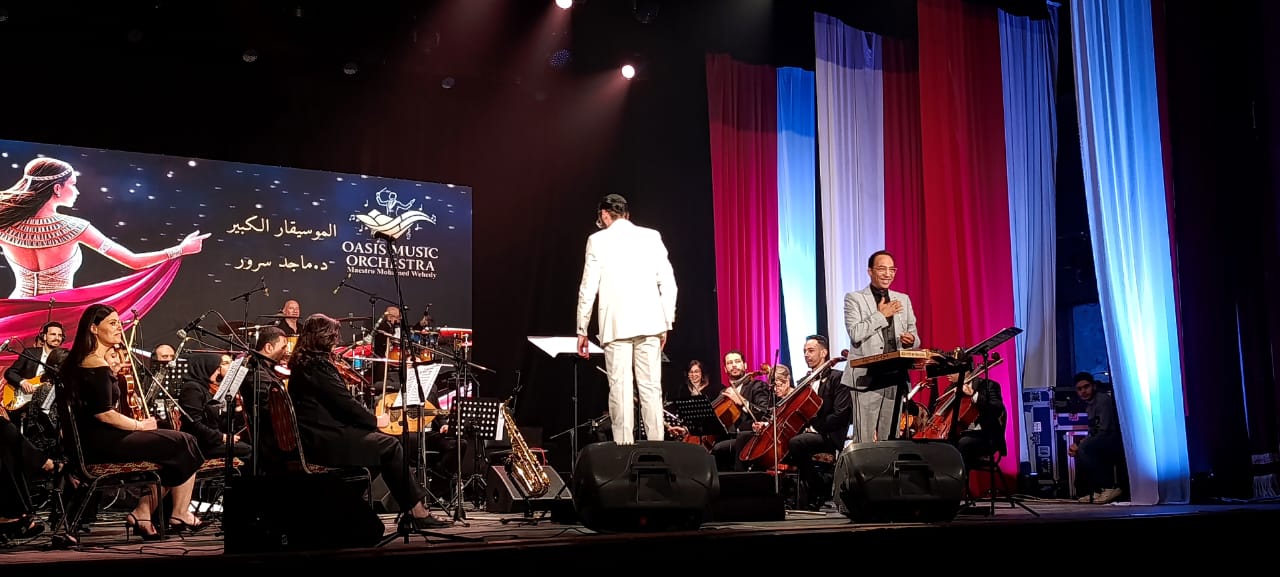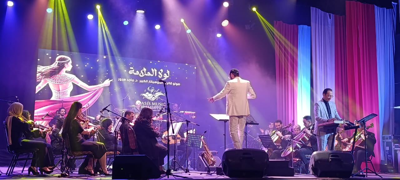 استهل الحفل بعرض موسيقي لأوركسترا الواحة بقيادة المايسترو محمد وهيدي، استمر قرابة ساعتين، وضم عددا من أشهر المقطوعات الطربية التي تفاعل معها الجمهور بالغناء والتصفيق، من بينها: ألف ليلة وليلة، على رمش عيونها، كل ما أقول التوبة، الدنيا ريشة في هوا، طاير يا هوا، وتلات سلامات بناءً على طلب الجمهور.