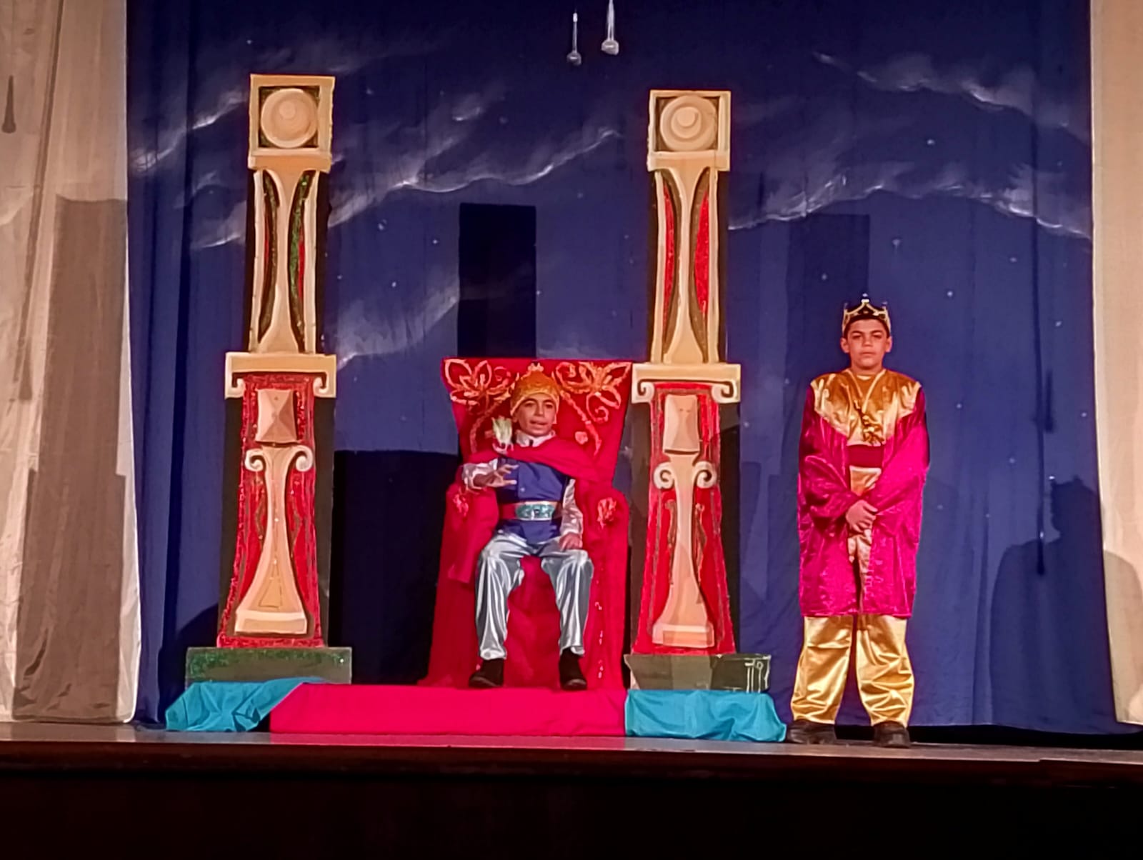 أما مشهد بيت الملك، فجاء بتكوين أكثر فخامة وهيبة، حيث تم تنفيذ هيكل الكرسي ليحاكي كرسي العرش، باستخدام أقمشة فاخرة مثل الفرو، وخامات لامعة كالجليتر، إلى جانب أعمدة خلفية مزخرفة، ما منح المشهد إحساسا بالرقي والسُلطة.