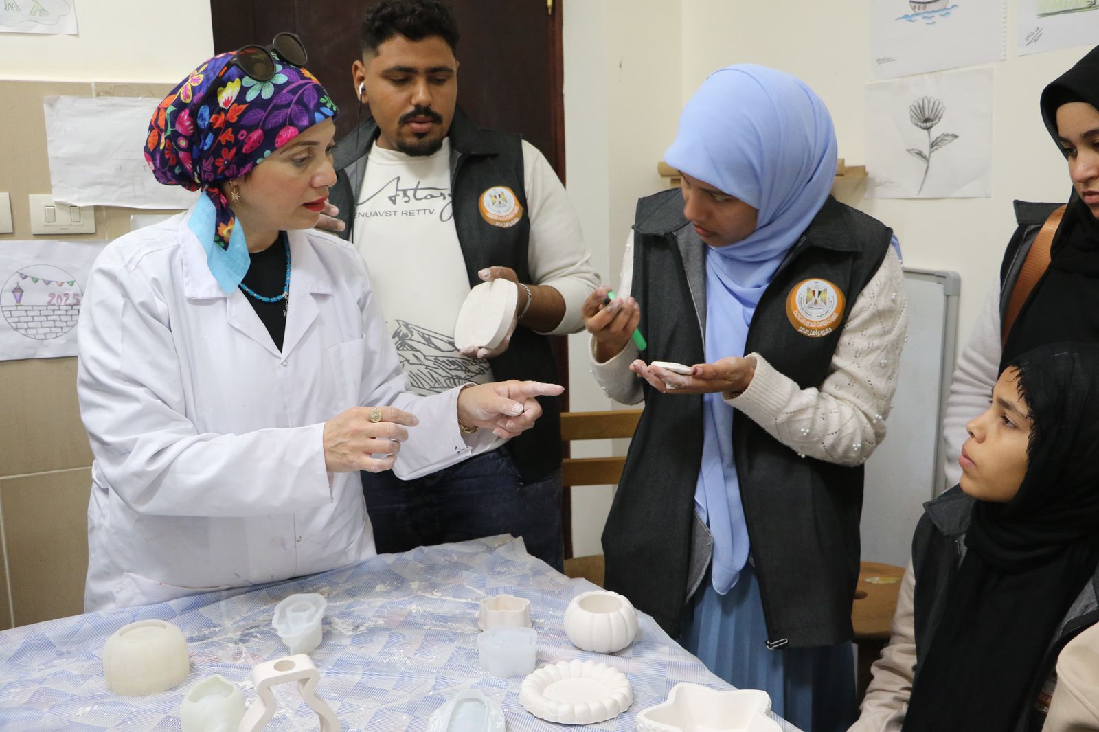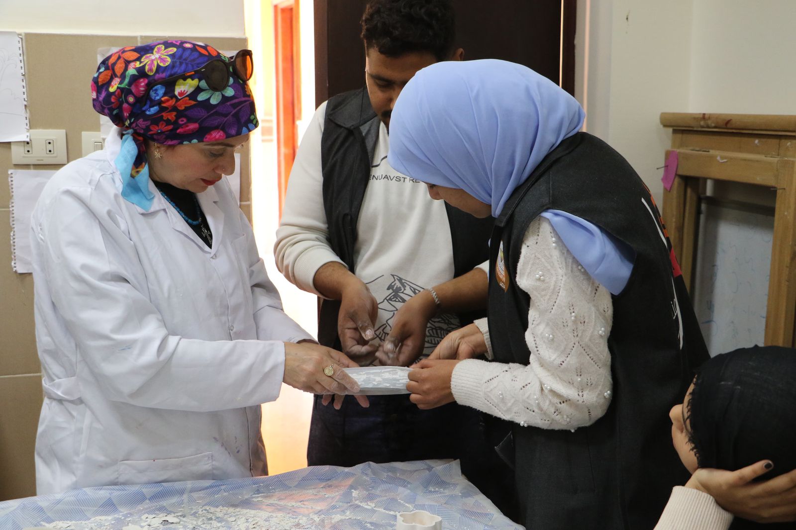 بدورها، تناولت الدكتورة أميمة رشاد كيفية نقل التصميم على الخزف، والألوان المستخدمة وخصائص ثباتها، وذلك خلال ورشة الرسم على الخزف باستخدام الطين الأسواني.