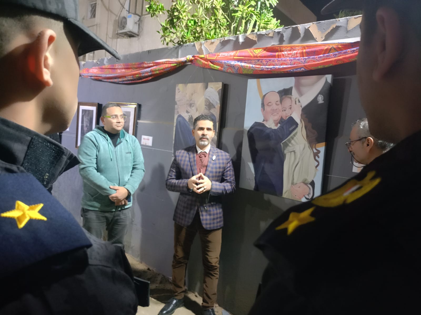 وأوضح الفنان إبراهيم أبو السعود مشاركته بعملين؛ الأول بعنوان "الأب الحامي"، منفذ بالألوان الزيتية على الكانفس، يجسد صورة الرئيس وهو يحتضن ابنة أحد الشهداء في مناسبة عيد الشرطة ويوم الشهيد، ويحمل دلالات الاحتواء والدعم لأسر الشهداء، أما العمل الثاني فاستلهم شخصية بائع الفخار في لحظة سكون وتأمل، تأكيدا على قيمة العمل اليدوي وأصالة المهن التراثية.