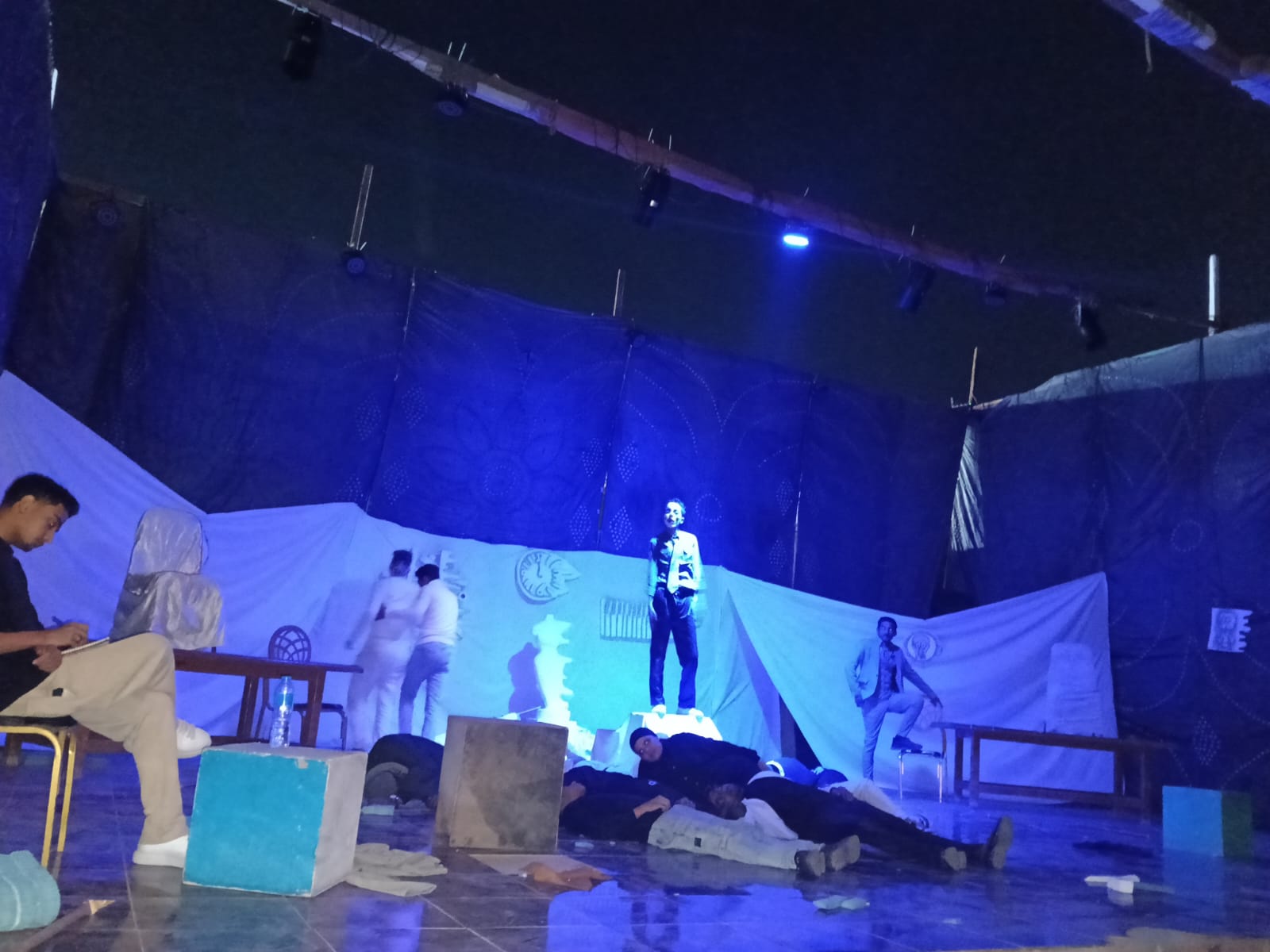 وجاء العرض الثاني بعنوان "أحيانا نتقدم إلى الخلف" لفرقة سوهاج، تأليف محمود محسن، وإخراج دياب كمال، ويقدم رسالة مفادها أننا لسنا بصدد إعادة سرد التاريخ، ولكنه يجب الموازنة بين العلم والضمير حتى لا يتقدم كل شئ بينما يتأخر الإنسان.