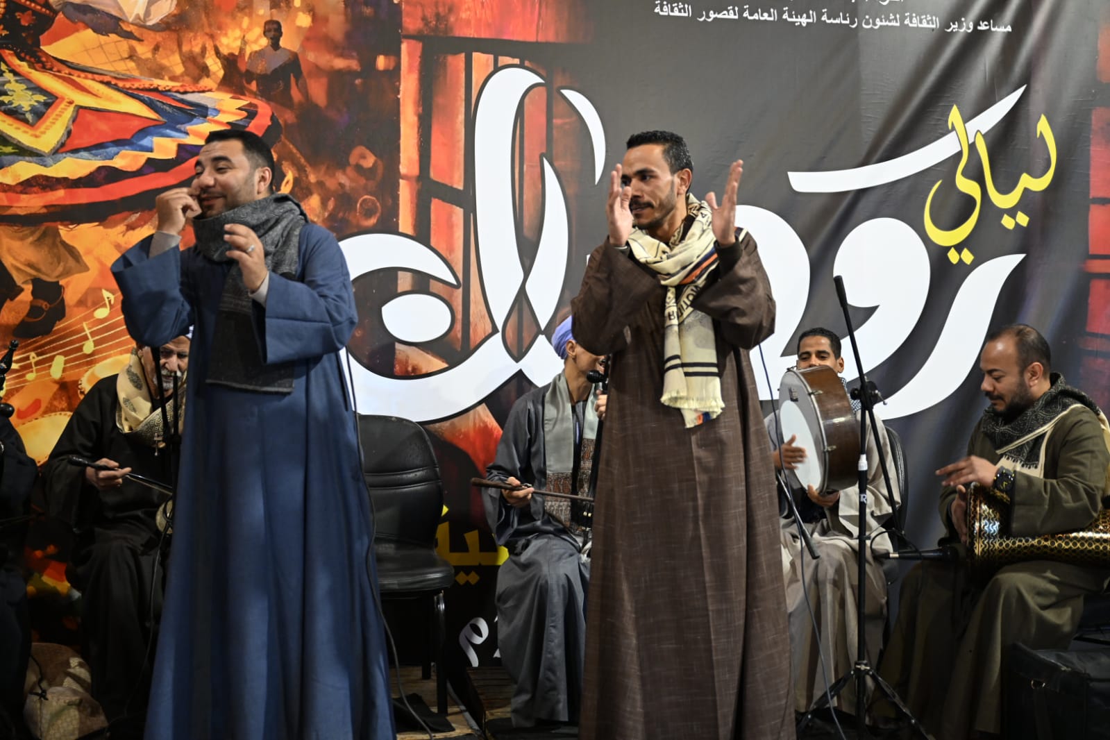 وفى بهو القصر، استمتع الحضور بفقرة للفن الشعبي عن العادات والتقاليد ومربعات بن عروس قدمتها عزت القرشي بمصاحبة نغمات الربابة والمزمار، تلاها قصة الأمير أبو زيد الهلالي وزواجه من ناعسة بنت زيد العجاجي، مع سرد تفاصيل ذهاب الأمير أبو زيد للملك حسن وسؤاله عن أفضل شاعر، ليجيب: إنه الأمير العجاجي، أعطاني سبحة من الياقوت والمرجان واللؤلؤ، كما أنه لديه بنت لا يوجد مثلها في الكون.