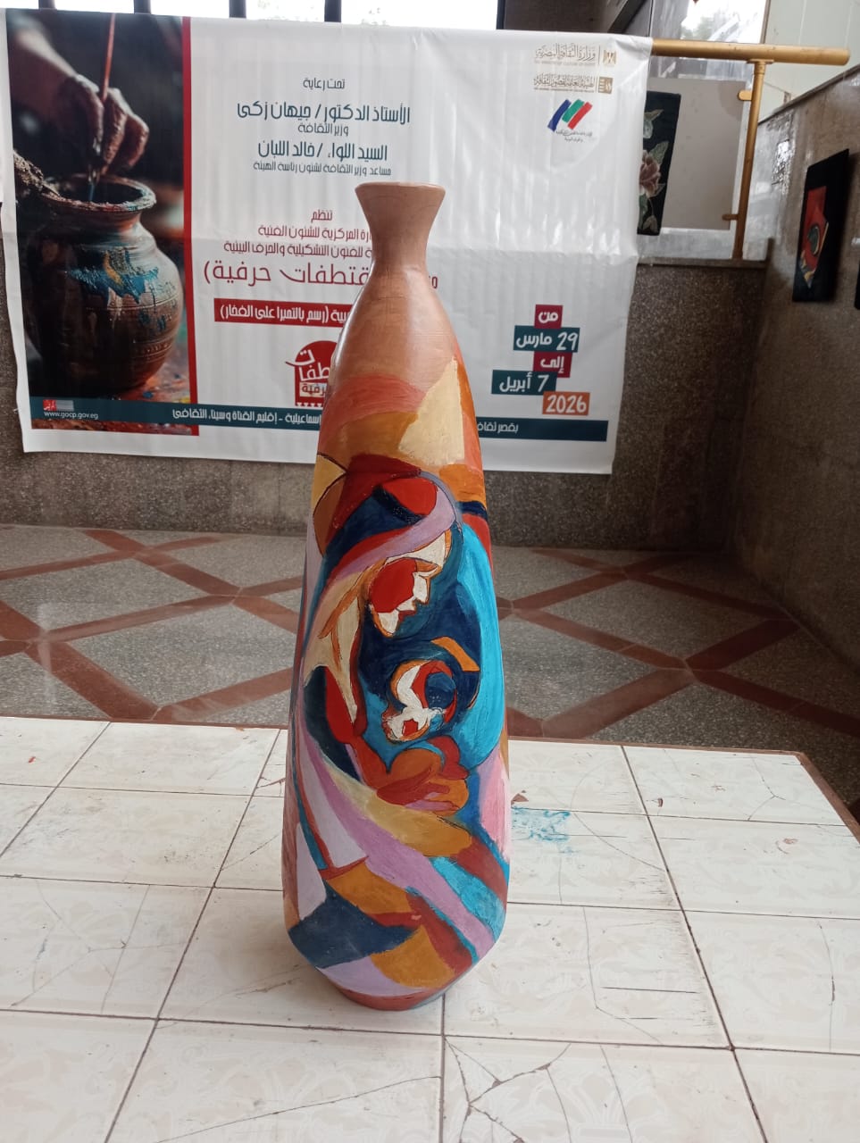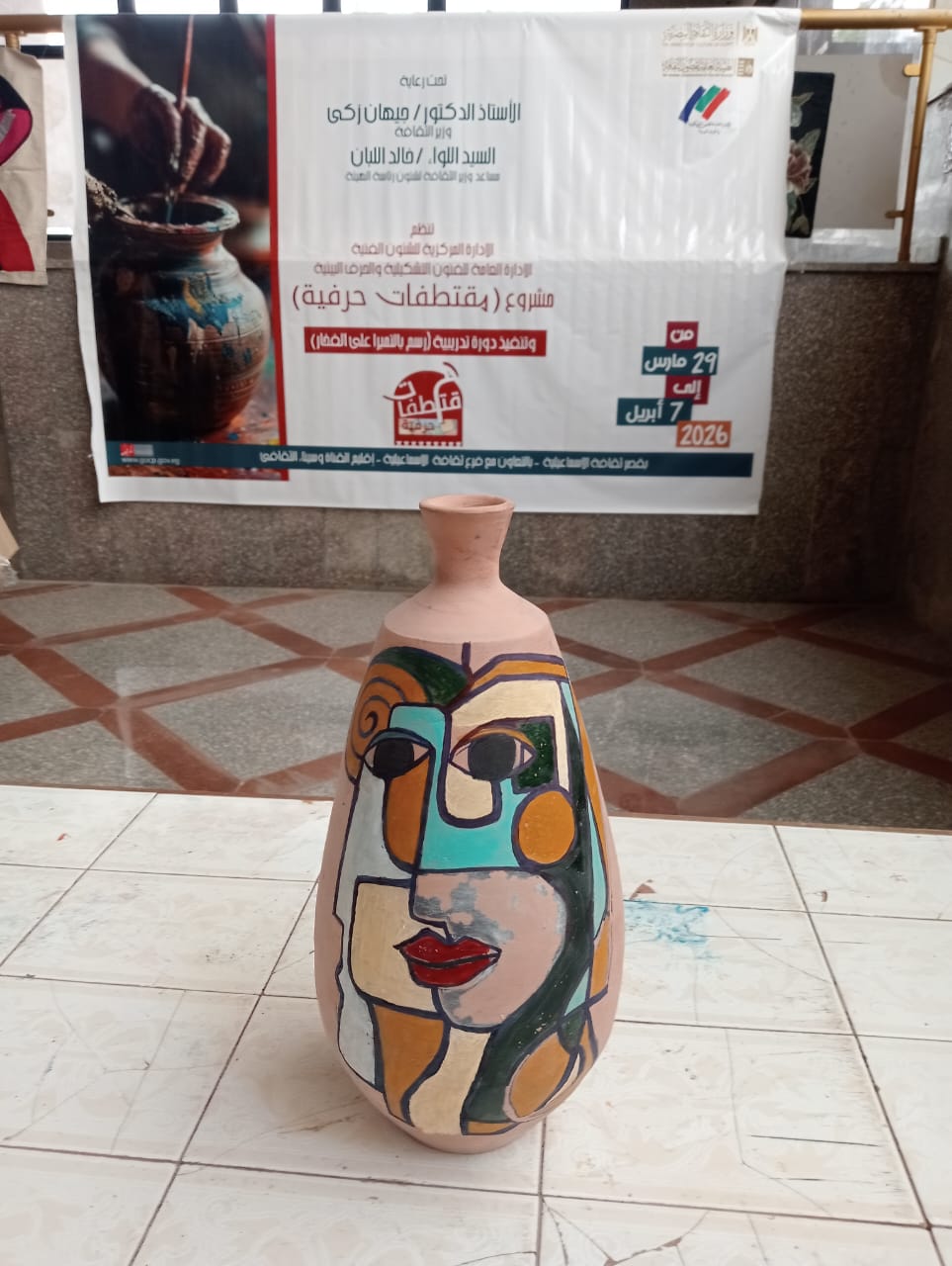 وأوضحت "ياقوت" أنها حرصت على إتاحة حرية الاختيار لكل متدرب في تحديد التصميم المناسب، بعد التأكد من ملاءمته لطبيعة الكتلة الفخارية المراد الرسم عليها، مشيرة إلى تنفيذ تصميمات متنوعة على خمس قطع فخارية متعددة الأحجام والأشكال.