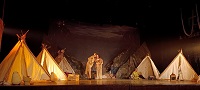 أوضحت مريم أحمد، مصممة الديكور أنها حرصت على تقديم سينوغرافيا توحي بالحياة البدائية البعيدة عن التحضر، من خلال استخدام خامات بسيطة، وتصميم قطع ديكور على شكل جبلين في الخلفية للدلالة على غياب مظاهر الحياة، وجاءت في هيئة جناحي طائر، كما صممت مجسما لشلال يبدأ في التدفق مع سقوط المطر، في إشارة إلى الخير والازدهار بعد دخول البطل إلى البلدة.