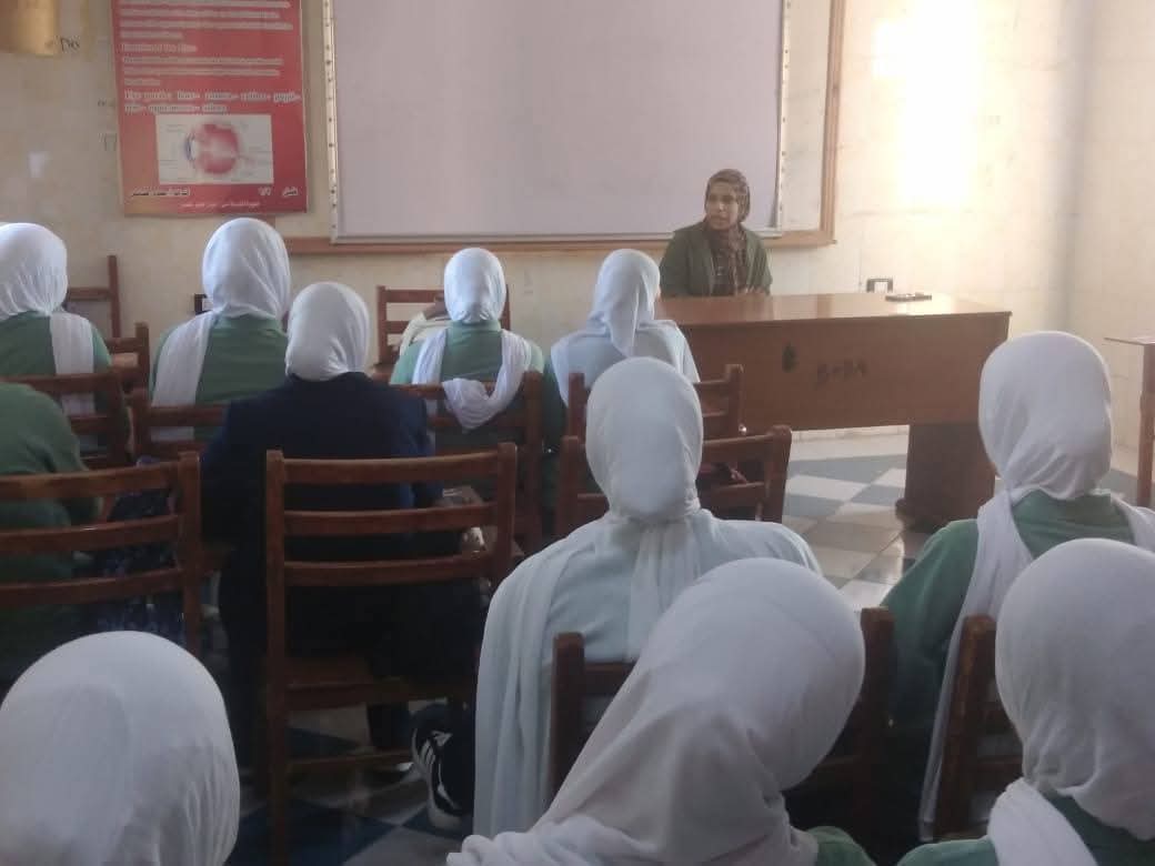 بمدرسة التمريض الثانوية، بعنوان "خطوات وارشادات للعناية بالغذاء والصحة"، قدمتها حنان يوسف، مديرة المدرسة، بمناسبة اليوم العالمي للصحة، أكدت خلالها أهمية تناول الطعام الصحي في بناء جسم الإنسان وإمداده بالطاقة التى تلزمه يوميا للقيام بأعماله بنشاط وحيوية.